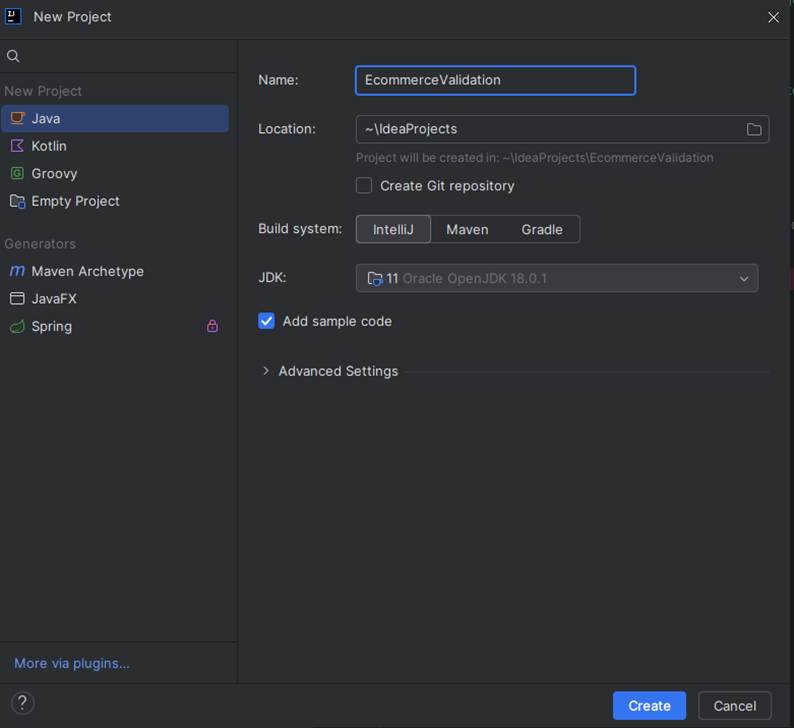 5. Beri nama project, misalnya: EcommerceValidation.