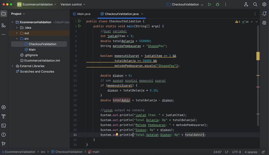 Dalam dunia e-commerce, saat pengguna melakukan checkout, sistem harus menghitung total harga dari produk yang dibeli dan memvalidasi apakah pelanggan berhak mendapatkan diskon. Logika ini harus dijalankan dengan tepat agar tidak merugikan pelanggan atau perusahaan.