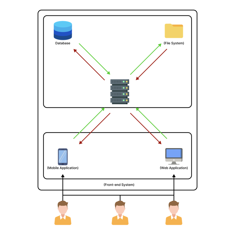 Gambar 1.1.2 menunjukkan arsitektur sistem secara keseluruhan untuk sebuah aplikasi. Sistem terdiri dari tiga bagian utama: pengguna yang mengakses sistem melalui aplikasi mobile atau web (frontend), server aplikasi sebagai middleware yang mengelola komunikasi antara frontend dan backend, serta backend yang terdiri dari database dan file system untuk penyimpanan data. Interaksi antar bagian dilakukan melalui server aplikasi yang menjadi penghubung antara pengguna dan penyimpanan data di backend. Arsitektur ini memudahkan pengelolaan data dan memperlancar proses komunikasi antara pengguna dan sistem.